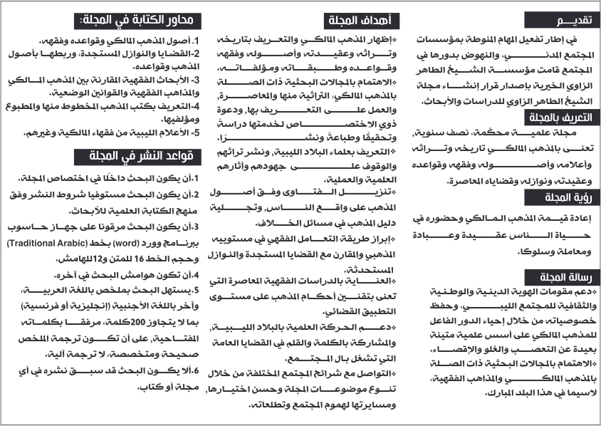 The editorial board of Sheikh Al-Taher Al-Zawi Journal for Studies and Research has the honor to invite professors and researchers specialized in the Maliki school of thought in particular and Sharia in general to write and publish in the scientific journal in its second issue, which is concerned with the Maliki doctrine, its history, flags, heritage, faith, origins, jurisprudence, rules, calamities and contemporary issues.