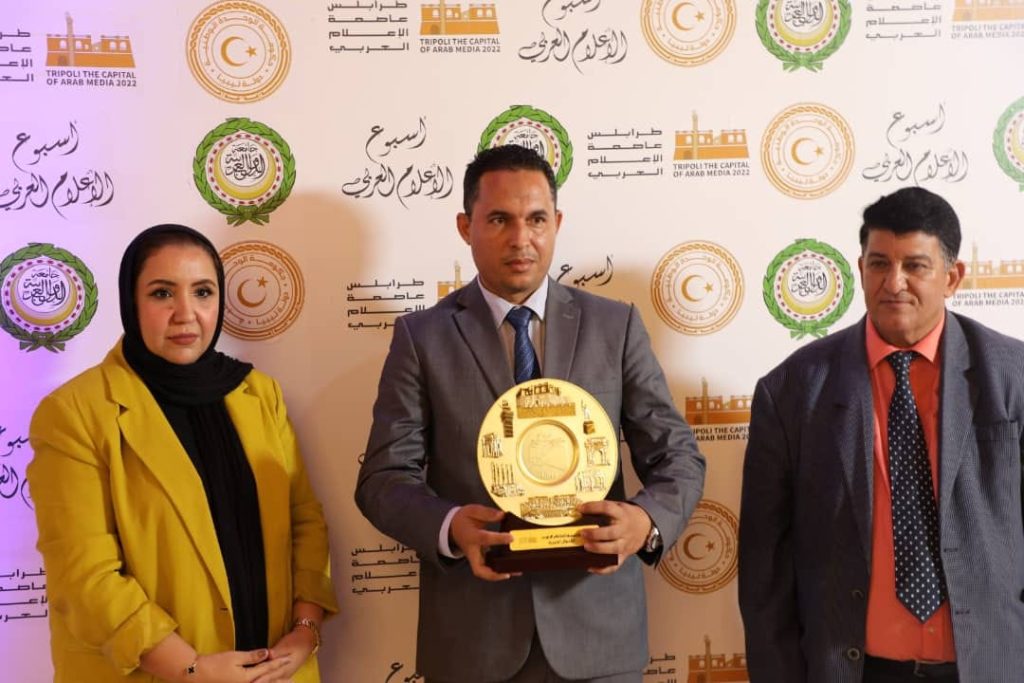 The honoring took place on the closing day of the Arab Media Week, which was attended by many government agencies concerned with media in Libya, in addition to media figures, journalists, academics, those interested in media in general, and a number of civil society institutions. The ceremony concluded with the distribution of awards to many bodies, including (the Foundation Sheikh Athar Al-Zawi Charity).