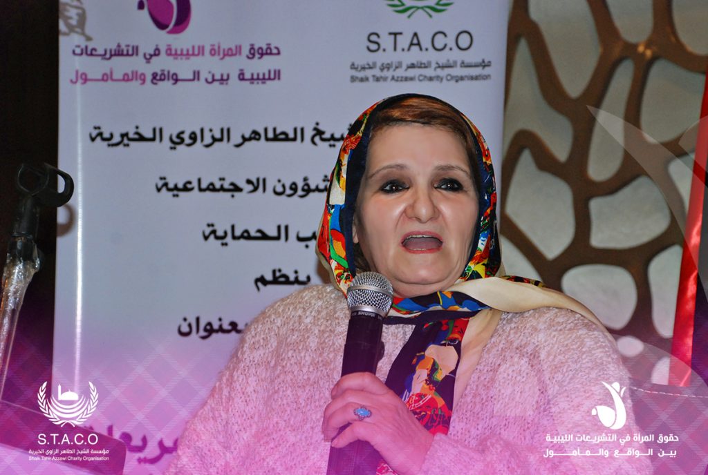 Then, the Director of the Protection Office at the Department of Social Affairs and member of the Scientific Committee, Dr. Najia Ayyad Atrak, gave her speech, in which she stressed the importance of women’s participation in the political, professional and social fields and the demand for equality more appropriate for Libyan women.