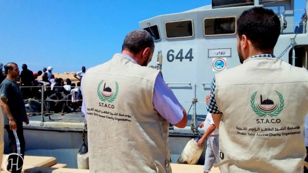 The team of the Sheikh Taher Al-Zawi Charitable Foundation (staco) provided humanitarian and medical aid to the migrants who were rescued at the disembarkation point in Al-Khums before being handed over to the shelter center.