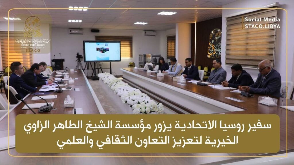 Engineer Salem Al-Qamoudi, Chairman of the Board of Directors of the Sheikh Taher Al-Zawi Charitable Foundation (STACO), received His Excellency the Ambassador of the Russian Federation to Libya at the Foundation’s headquarters. The meeting discussed ways to cooperate in the humanitarian, cultural, and scientific fields, as well as exchanging expertise and benefiting from the Russian experience in academic research and development.