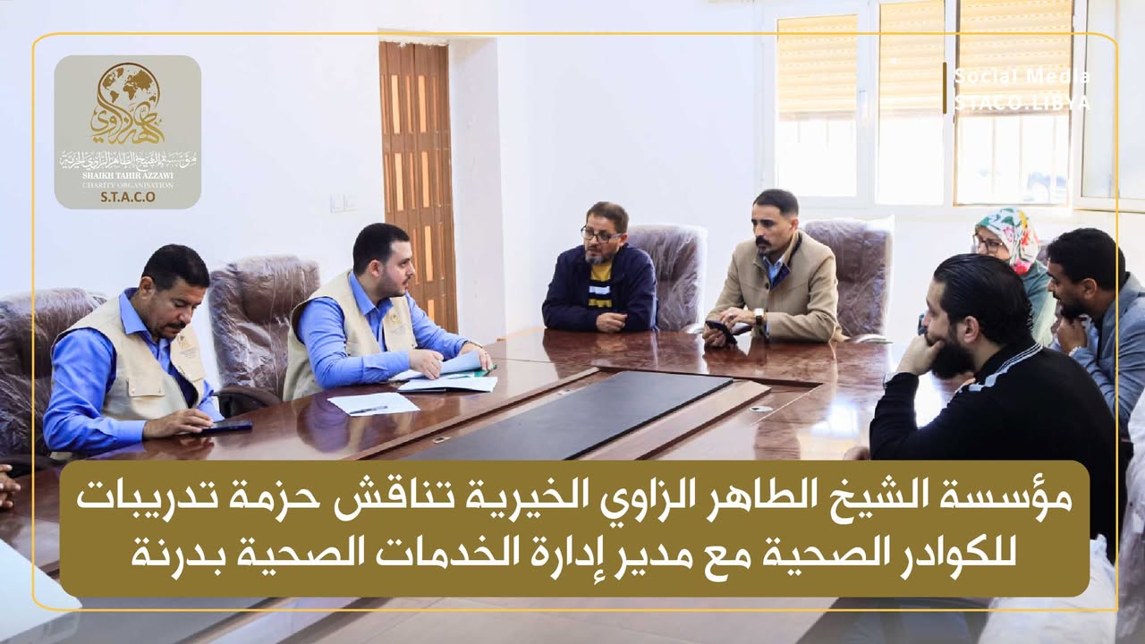 The Director of the Programs and Projects Department at Sheikh Taher Al-Zawi Charitable Foundation, accompanied by the Director of the Derna Office, held a meeting with Dr. Hamza Al-Shaeri, Director of the Health Services Department in Derna, and his team, in the presence of a number of directors and employees of health facilities in the region.
