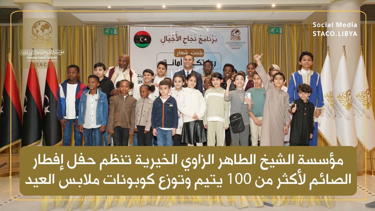 In an atmosphere filled with warmth and joy, the Sheikh Taher Al-Zawi Charitable Foundation (STACO) organized an iftar for over 100 orphaned children. This event is part of its ongoing efforts to support and care for orphans and promote the spirit of social solidarity during the holy month of Ramadan.