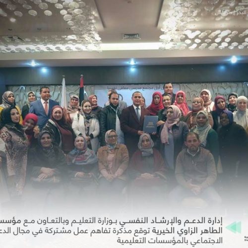 In a distinguished step, the Sheikh Al-Taher Al-Zawi Charitable Foundation, in partnership with the Department of Psychological Support and Guidance of the Ministry of Education, laid the foundation stone for building a good and sound youth imbued with the spirit of citizenship and the facts of peace in a healthy and cohesive society and with a strong social fabric, by providing psychological and social support to our children within educational institutions, where the Foundation signed Sheikh Al-Taher Al-Zawi Charity / STACO and the Psychological Support Department at the Ministry of Education, a memorandum of understanding for joint work in establishing projects related to the field of psychological support within educational institutions in various parts of Libya.