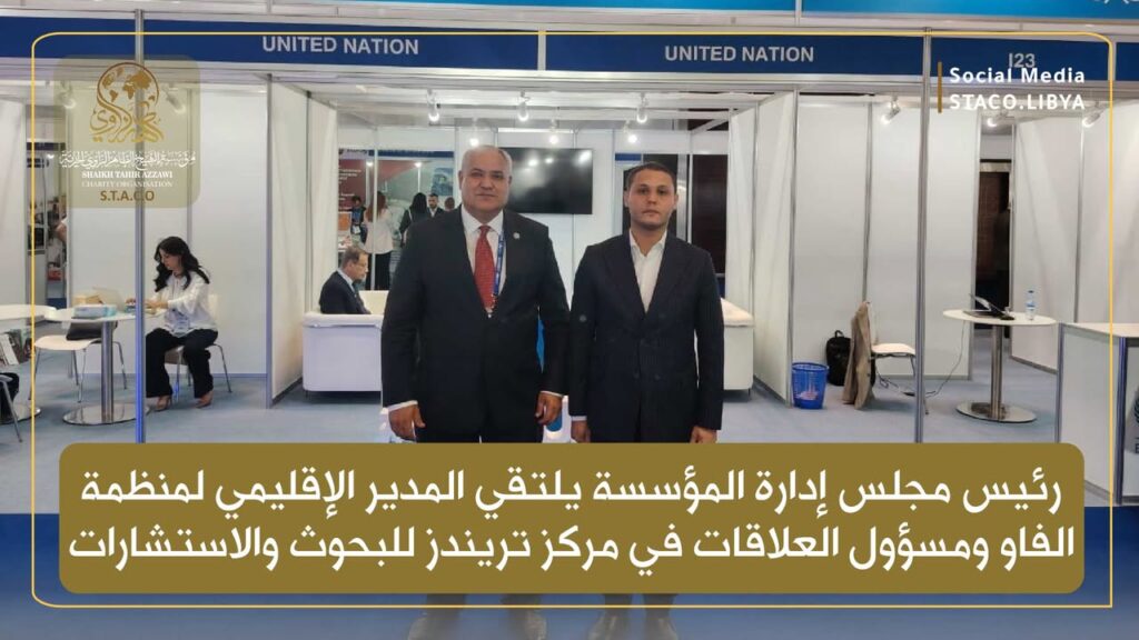 On the sidelines of the Foundation’s participation in the DIHAD 2025 Conference in Dubai, Engineer Salem Al-Qamoudi, Chairman of the Board of Directors of the Sheikh Taher Azzawi Charitable Foundation (STACO), met with Dr. Abdulhakim Al-Waer, Regional Director of the Food and Agriculture Organization of the United Nations (FAO) for the Near East and North Africa.