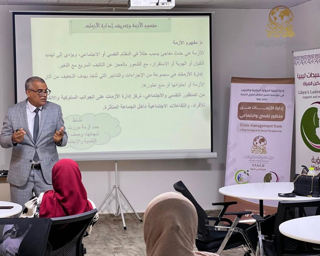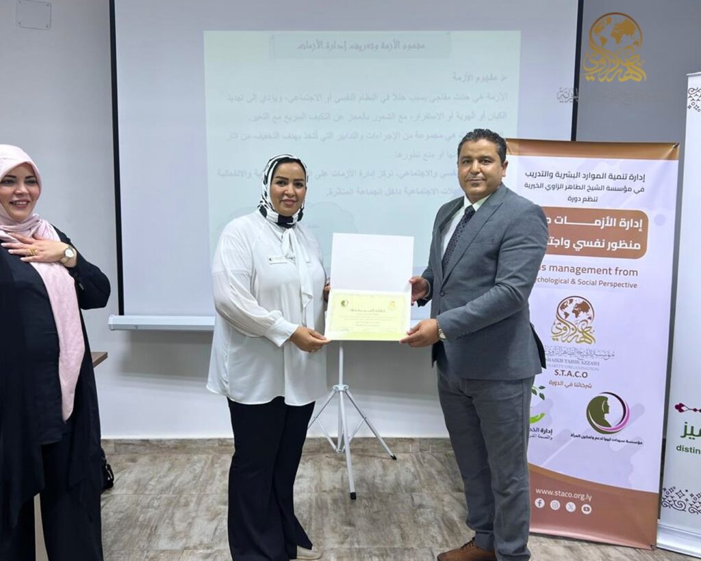The Human Resources Development and Training Department at Sheikh Al-Taher Al-Zawi Charitable Foundation, in cooperation with the Department of Social Service, School Health, and Psychological Support at the Ministry of Education, and the Libyan Women’s Foundation for Support and Empowerment, concluded the training course entitled “Crisis Management from a Psycho-Social Perspective”, as part of the Women and Peace Campaign activities.