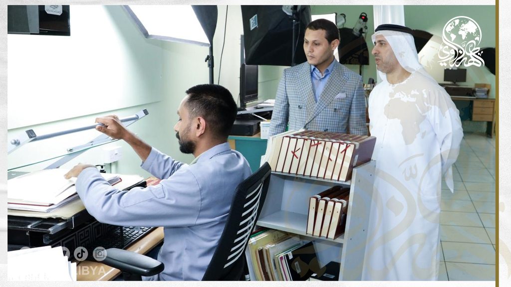 The Chairman of the Board of Directors, with those responsible for the Center, toured the libraries and publications, and learned about the process of preserving books and electronic archiving, stressing the necessity of benefiting from this scientific experience in the fields of scientific research in Libya, while the Director General of the Center, and the necessity of cooperation, coordination, and exchange of publications between the Center, and Sheikh Tahir Al-Zzawi charity organization.